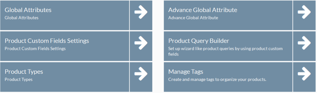 This is the main selection page to specify various attributes and properties for products. The following options are available. After you select a group, a page will be opened where you can set the settings for selected group.