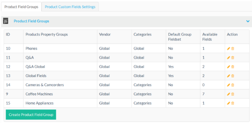 At the product field groups tab, you can manage you current product field groups, create new groups, edit or delete them.