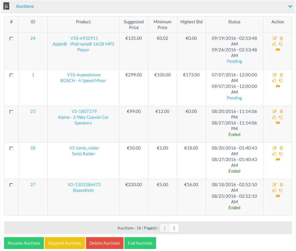 Click on the “Resume Auctions” button to resume all selected auctions. You might want to resume an auction, if it was previously suspended or manually ended.