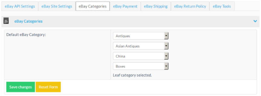 | Default eBay Category | The default eBay category to use when listing items on eBay Selecting a category, will open a dropdown box, with all available sub categories until the last category in the category tree is selected. When the last category is selected, “Leaf category selected” appears at the bottom. This category will display as preset category at the eBay tab at the product’s details page . |