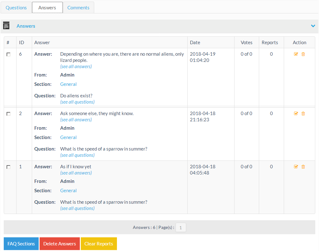Click on the check icon to clear any reports for the selected FAQ comment.