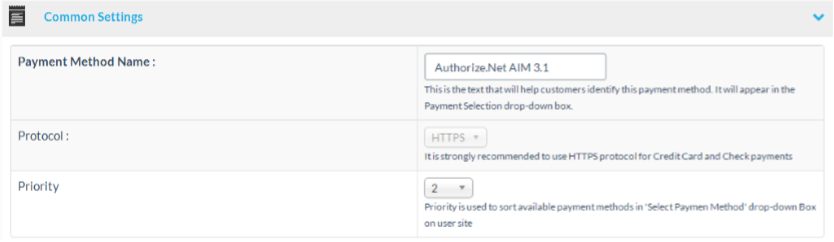 At the common settings section you can edit the payment method’s name. This will affect the name of the payment method at the storefront. You can also set the protocol mode for the payment method and change the sorting priority.
