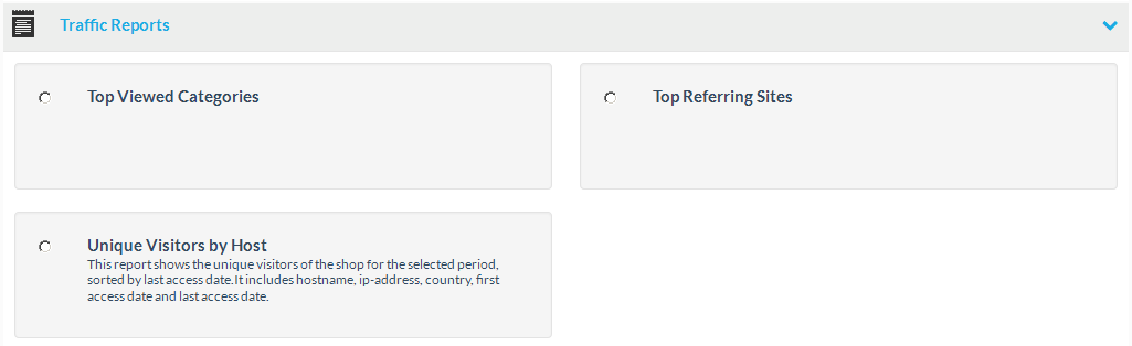 This report shows the unique visitors of the shop for the selected period, sorted by last access date. It includes hostname, ip-address, country, first access date and last access date.