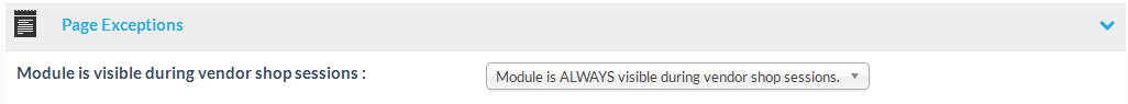 | Module is NEVER visible during vendor shop sessions. | The module is only visible, when opening general shop pages. The module will not appear if a vendor specific version of a page is opened |