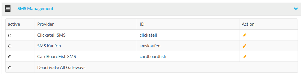 Selecting a gateway from this list will automatically set this gateway as active gateway and the shop will use it for any SMS notifications.