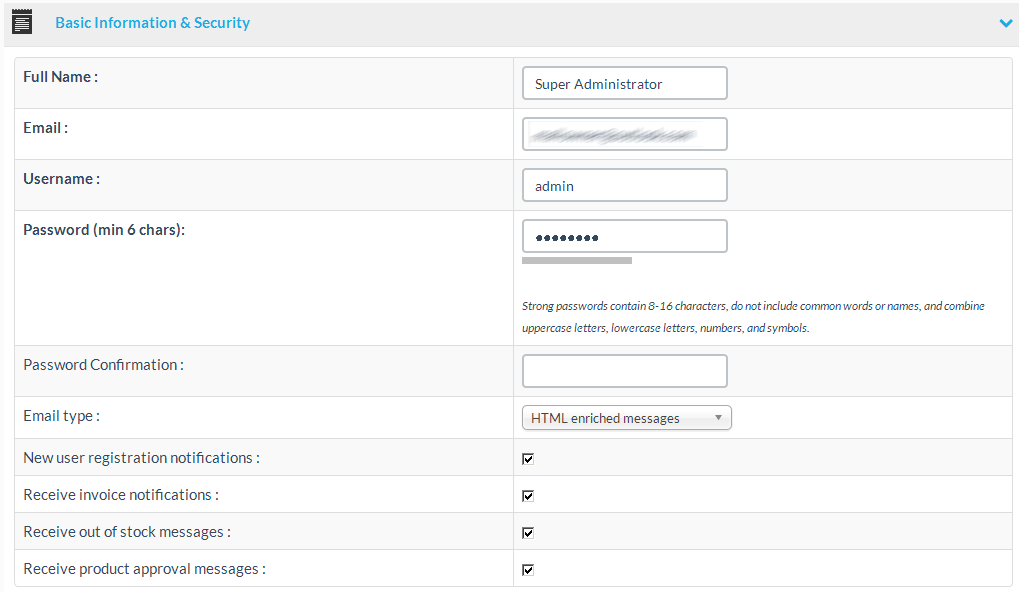 At the basic information & security section you set the basic vendor details, like name,email, password, and several notification message settings.