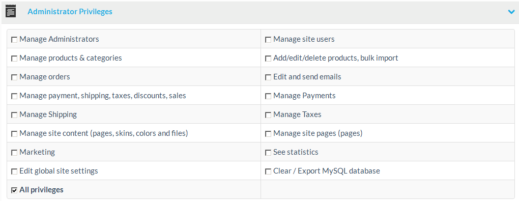 | Manage Administrators | Create, edit and delete administrator accounts |