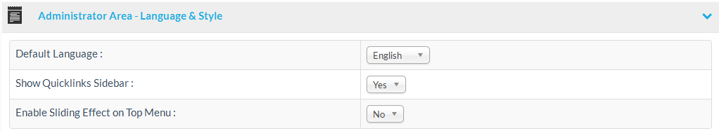 At the administrator area language and style section you can check and set the language for the admin area, if the sidebar should be shown or not and if the sliding top menu should be enabled or not.