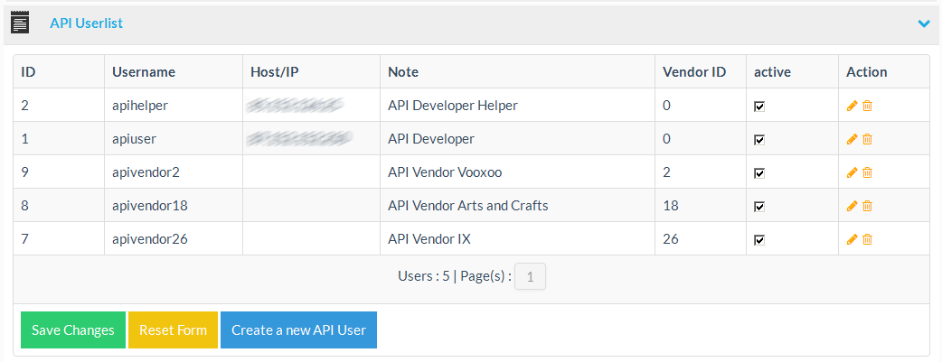 The API userlist shows information about the current API users. The information shown includes, the internal ID, the username, the valid host/IP for that user, a note, the vendor ID and if the API user account is currently active or not.