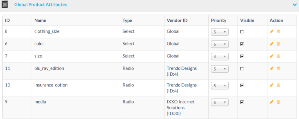 The global product attributes list, shows information about all current global product attributes. It shows information like the attribute’s internal ID, the name and type of the attribute, the vendor and vendor ID of the attribute, or if it is a global attribute, the priority of the attribute and if it is currently active and visible at the product’s details page.
