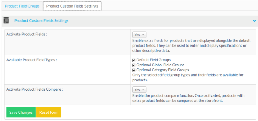 The product custom field settings tab allows you to enable certain product field functions or to disable them completely.
