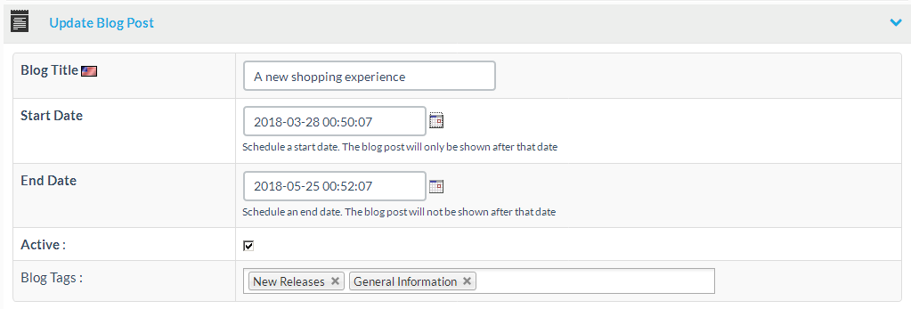 | Blog Tags | You can select several blog tags Blog tags are used to categorize your blog article and filter blog articles that are set for a specific tag/category |