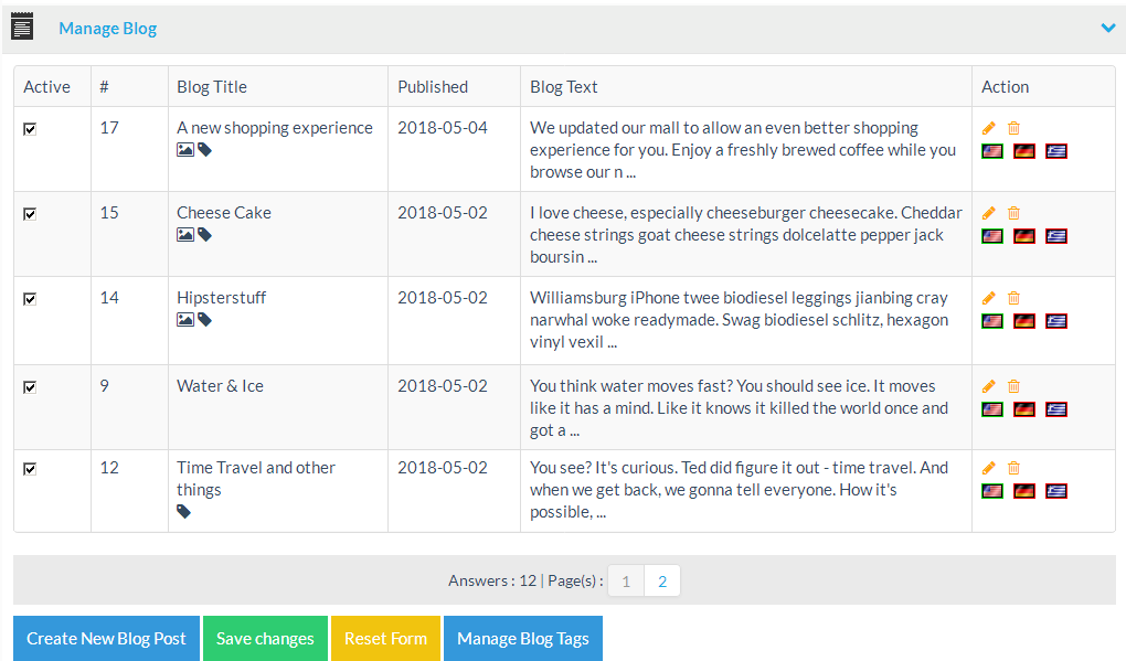 | Action | Additional functions to manage the blog posts and also language flag indicators for any language specific versions of the blog article. |