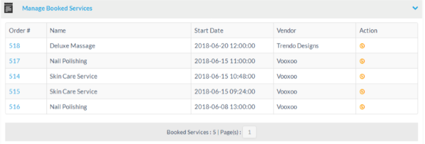 The manage booked services section shows a list of all ordered booking products/services.