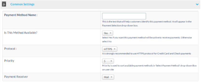 At the common settings section you can edit the payment method’s name. This will affect the name of the payment method at the storefront. You can also set the protocol mode for the payment method and change the sorting priority and set the payment method to active or not active.