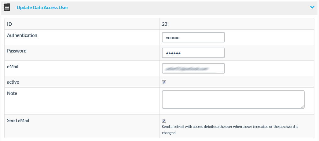 | Active | Indicates, if a data access user is active or not. Turn this setting off, to temporarily restrict access for this user. |