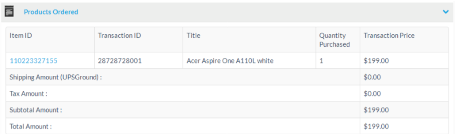 The products ordered section shows detailed information about the ordered eBay items, as well as the order calculation, including taxes, shipping amount, etc..