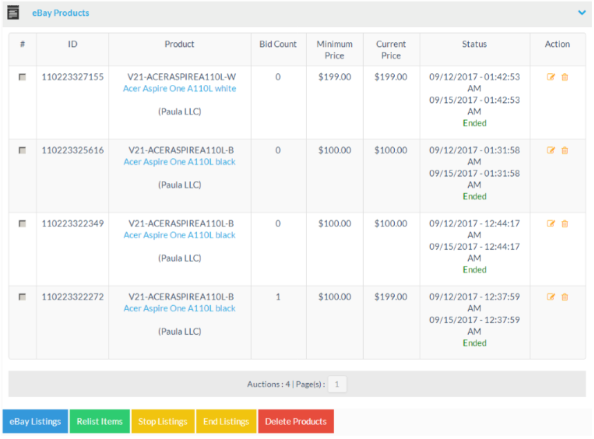 The action icons at the right side of the list, allow you to access several other eBay product and listing functions.