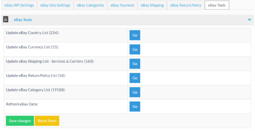 The eBay tools form, shows an overview of the current eBay data stored at the local shop database. Each item shows in brackets how many items are stored for this type of data.