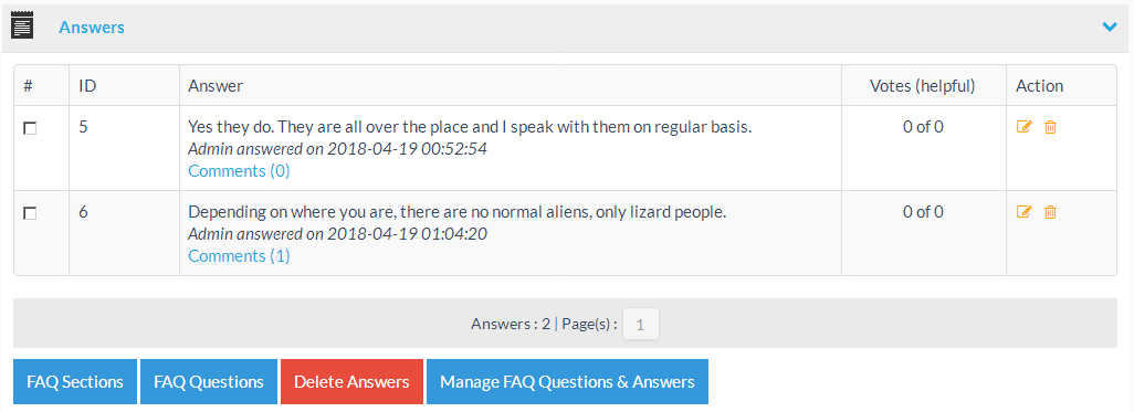 At the FAQ answers page you can check and manage FAQ answers or add answers to the selected question.