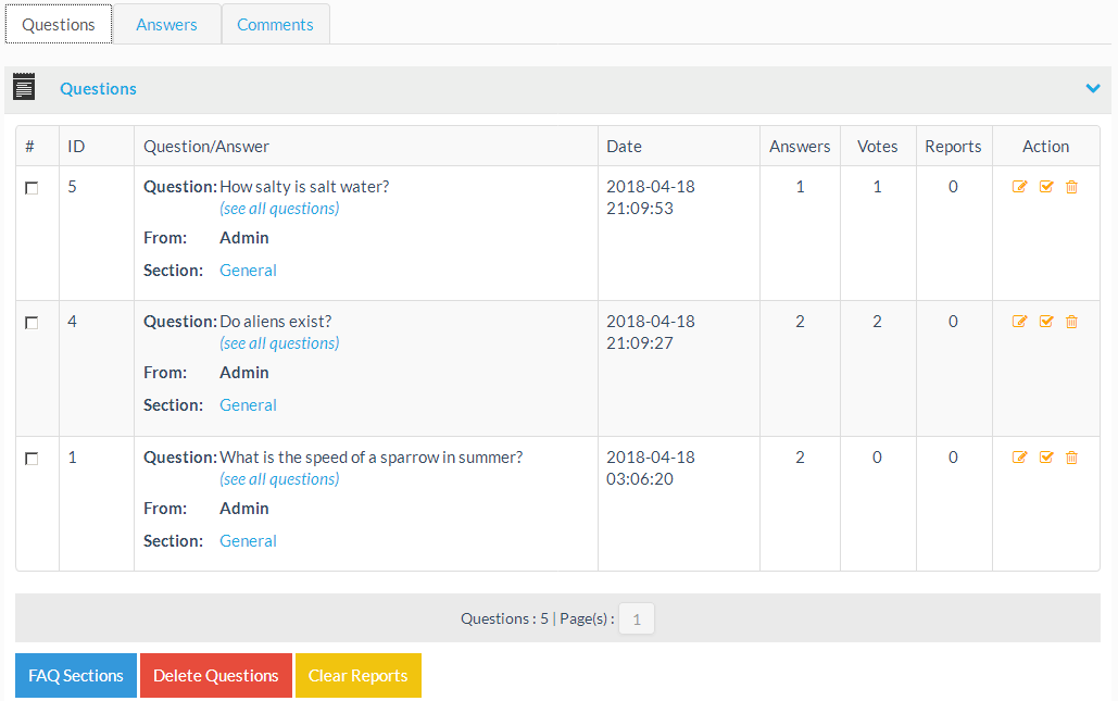 The questions tab show a list with all questions in chronological order with additional information about the question’s author, the date the question was added, the number of answers added to a question, the number of upvotes and the number of reports for a question.