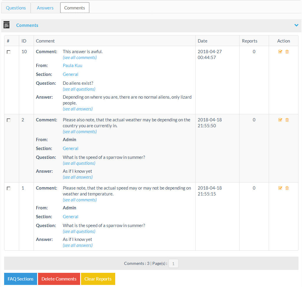 Click on the check icon to clear any reports for the selected FAQ comment.