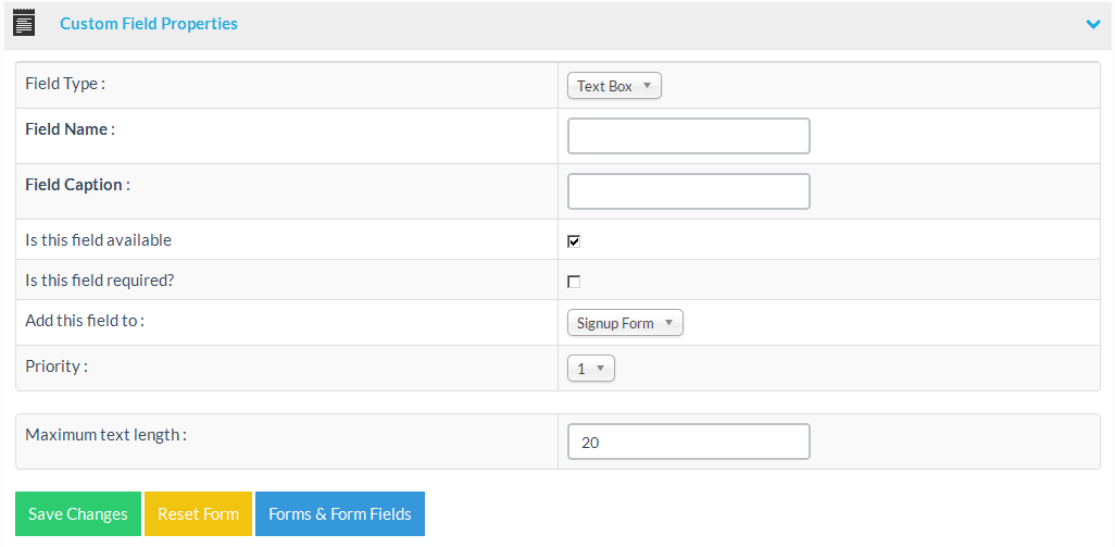 | Maximum text length | This field allows you to set the maximum text field length. |