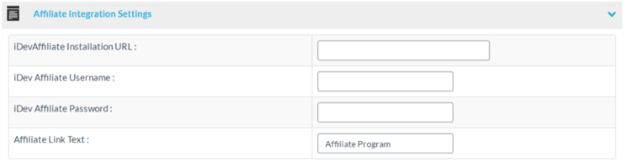 At the affiliate integration section you can setup your iDev installation login credentials and the installation url as well as an affiliate link text.