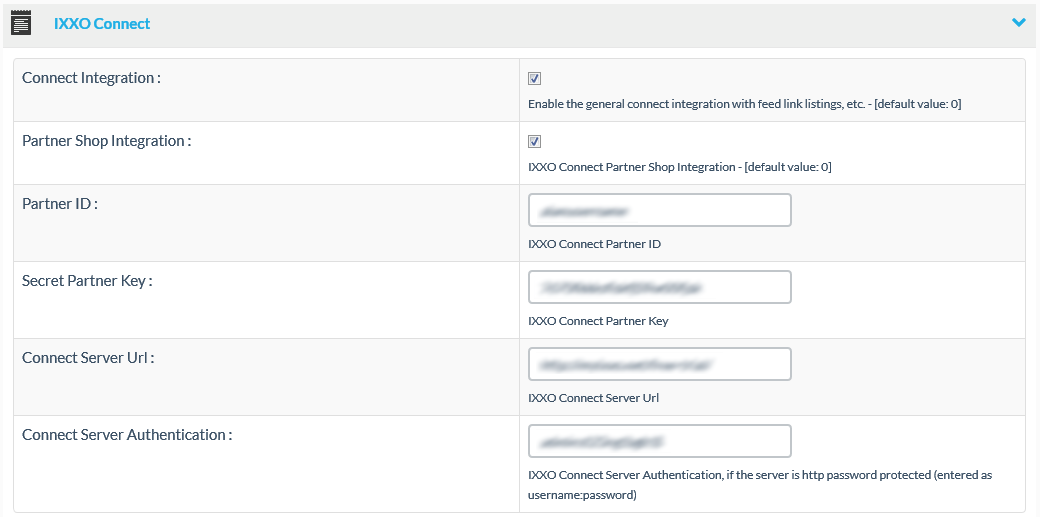 | Connect Server Authentication | Optional server authentication, if the server is http password protected (entered as username:password) Only necessary for the Partner Shop Integration |