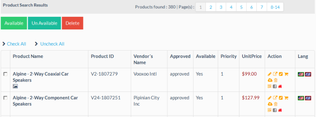 The list shows crucial information for each product, like the product name, the product ID, the vendor that is offering that product, if an image was uploaded for the product, if the product was approved, if it’s available, the sorting priority, the unit price and if the product was edited for the enabled languages. If you click on a product, the product details page will be opened, where you can see and edit all details of the specific product. Several other functions are available through the action icons on the right.