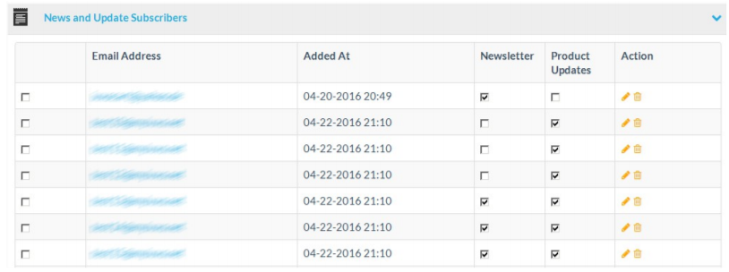 The news and update subscribers list shows detailed information about your subscribers. The information shown includes, the email address, the date of the initial subscription and if the subscriber subscribed to newsletters and/or product updates.