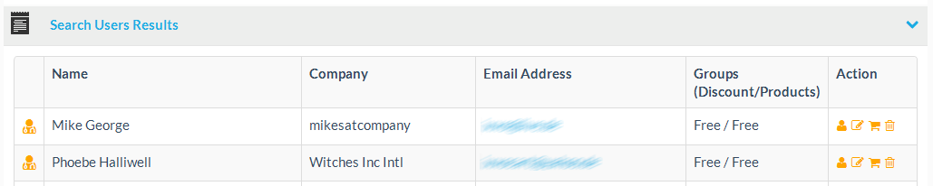 The action icons at the right side of the list, allow you to access several user functions. You can either edit an account, permanently delete an account, create a manual order for that user or show the users orders.