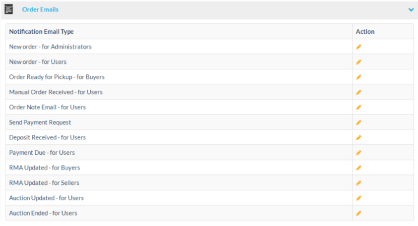 The following email notification types are available at the order emails section:
