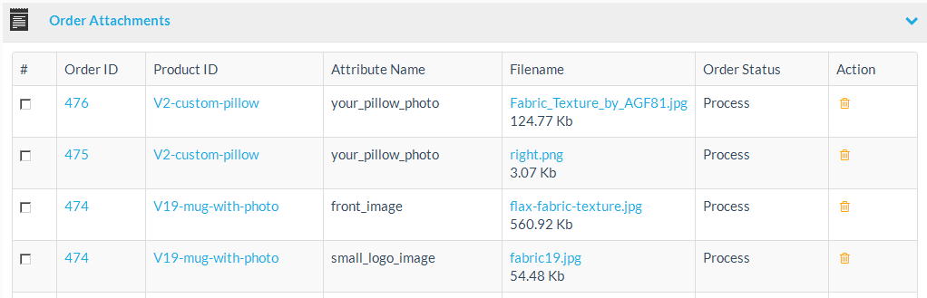 The order attachments list shows an overview of all files, submitted for orders. It includes information like the order ID, product ID and attribute name the file was submitted for and also the original file name and the overall order status.