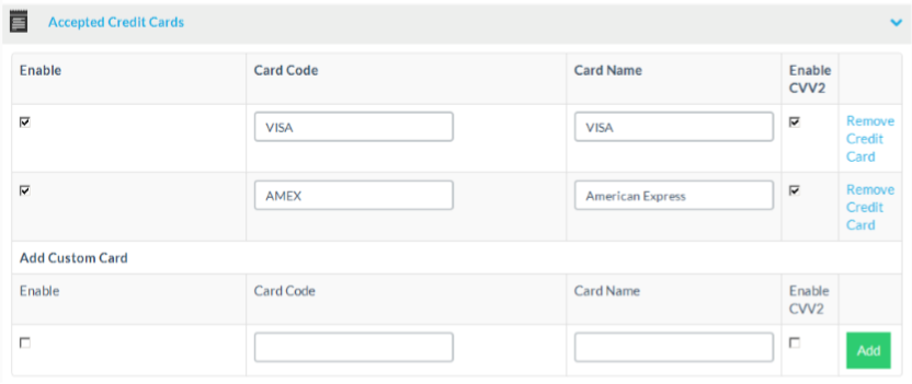 At the accepted credit cards section, you can setup credit cards for distinct payment gateways. You can set a shortcode, that is used by the payment gateway itself to identify the credit card type, the name of the card that will appear at some select boxes, if you want to use CVV2 and if you want to enable this credit card.
