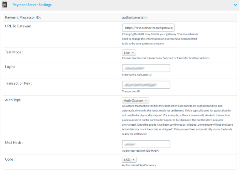The payment server settings section will differ widely, depending on the selected payment method you are editing. Typically, some settings are common among most payment gateways.