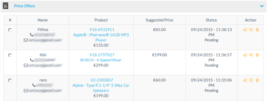 The price offers list shows all currently submitted price offers. It shows detailed information about the product and the customer .You also get contact details of the customer and the current status of the price offer.
