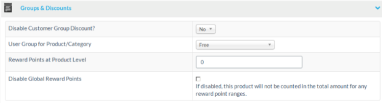 | Disable Global Reward Points | If disabled, this product will not be counted in the total amount for any reward point ranges. Please note: This setting only affect reward points awarded for the total purchase amount, not the reward points at product level. Refer to the points management page for further information about points. |