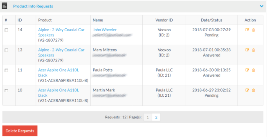 Click on the “Delete” button to bulk delete several selected product information requests at once.
