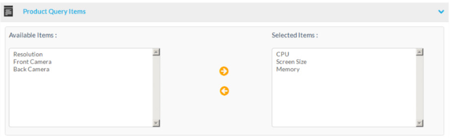 To add a product field to a query, select a product field on the left select box (available items) and click on the arrow pointing to the select box to the right side (selected items).