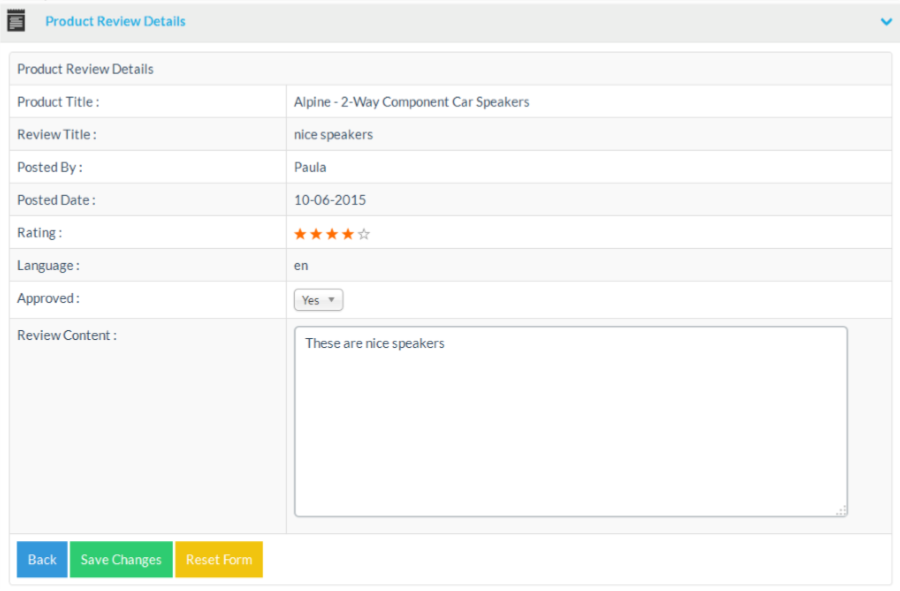 The product review details form allows you to edit a review, especially if you need to remove unwanted references to other sites or shops or strong language.