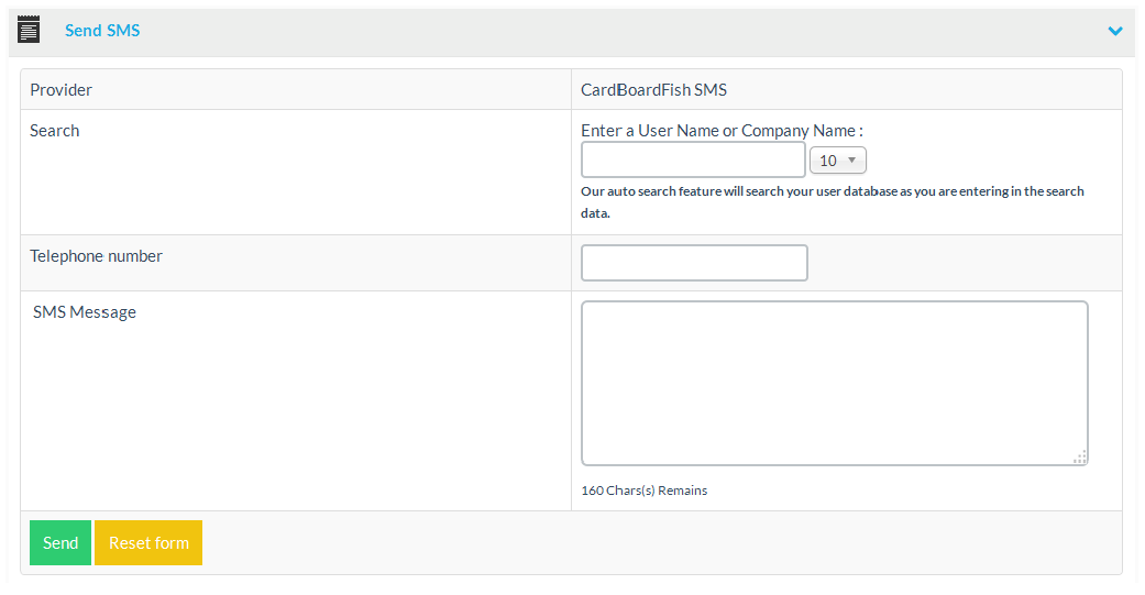 Use the send SMS form to send short messages to mobile phone users.