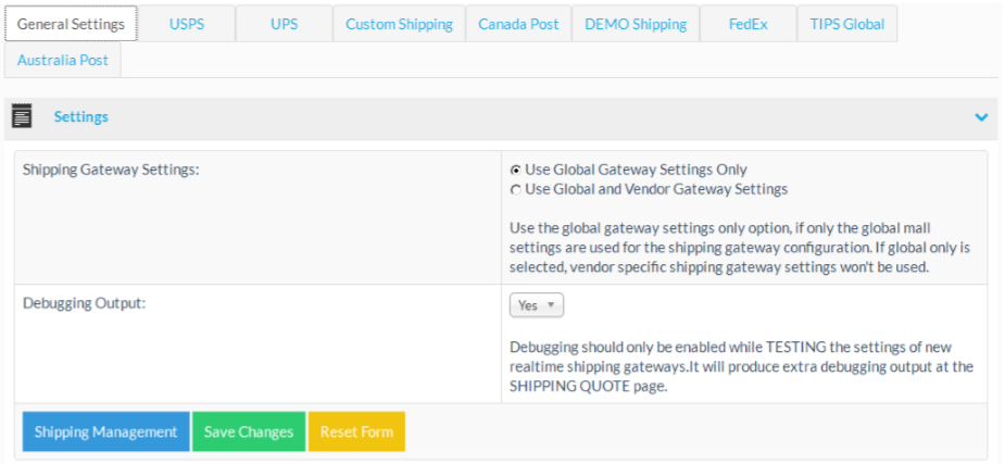 The general settings page lets you select, how shipping gateways are configured and handled. It also provides you with an option to debug your shipping gateway settings.