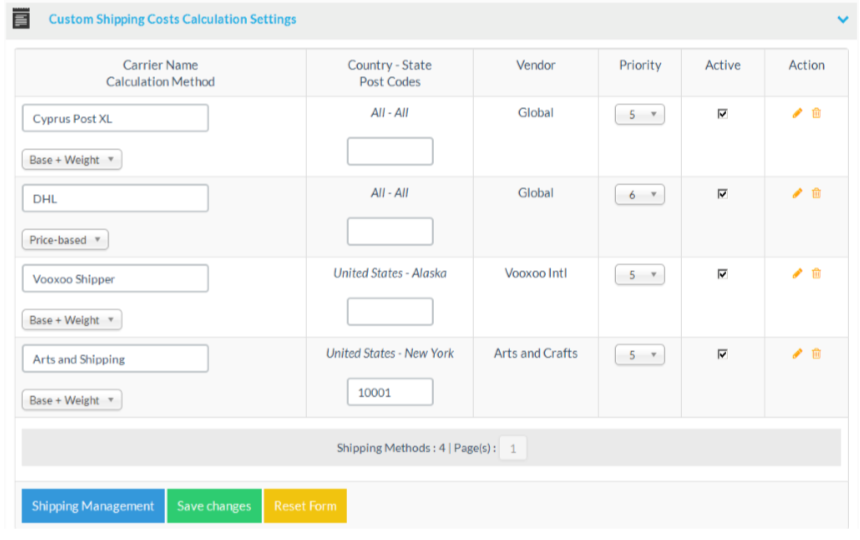 The displayed information includes, the shipping carrier name and calculation method, the shipping destination countries and states/provinces and post codes the method is valid for, if the method is global or vendor specific, the priority of the method and if the method is active or not.