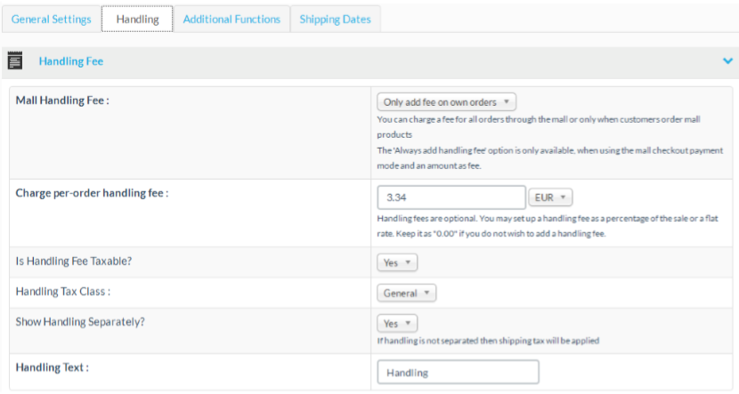 | Mall Handling Fee | You can charge a fee for all orders through the mall or only when customers order mall products. The “Always add handling fee” option is only available, when using the mall checkout payment mode and an amount as fee. |
