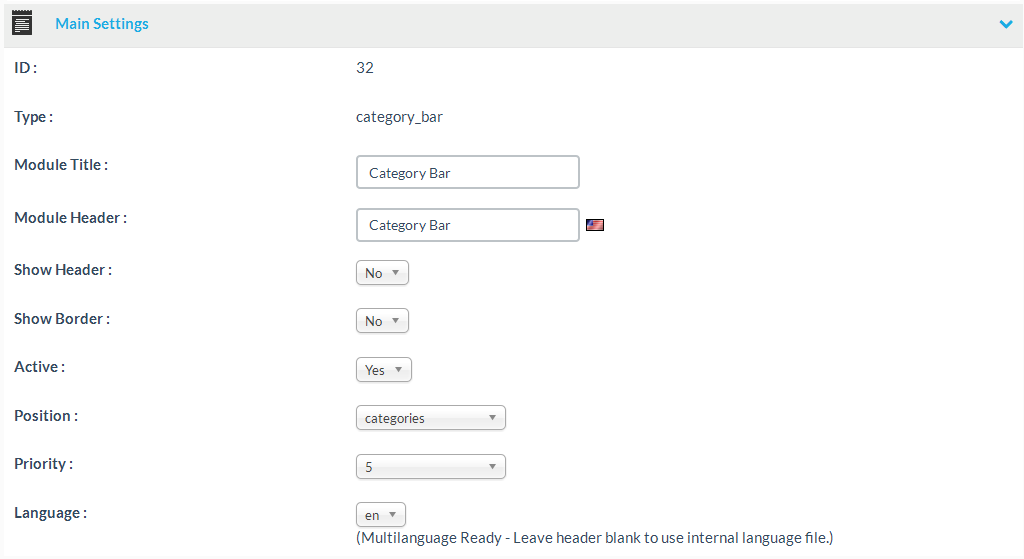 | Language | The language for title and content of the module. Please note: Some modules are “multilanguage ready” which means they will use your shop storefront language files for the module headers. If you want to use the language file text, instead of the text you can enter at the details page, leave the header field blank. |