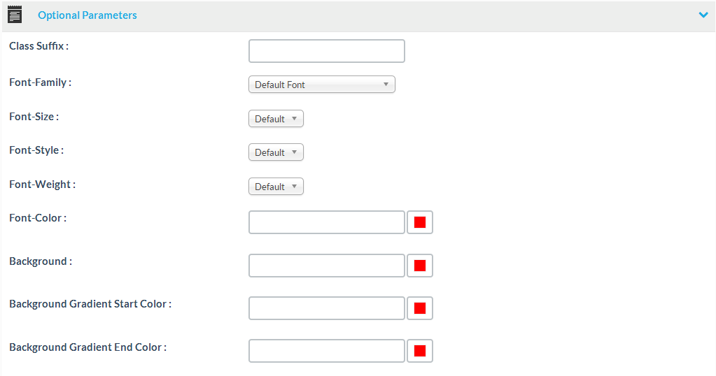 You can setup optional parameters at this section. Optional parameters affect the styling of your module. If you don’t won’t to change the styling of the module, you can ignore those settings and leave the fields at their default and blank settings.