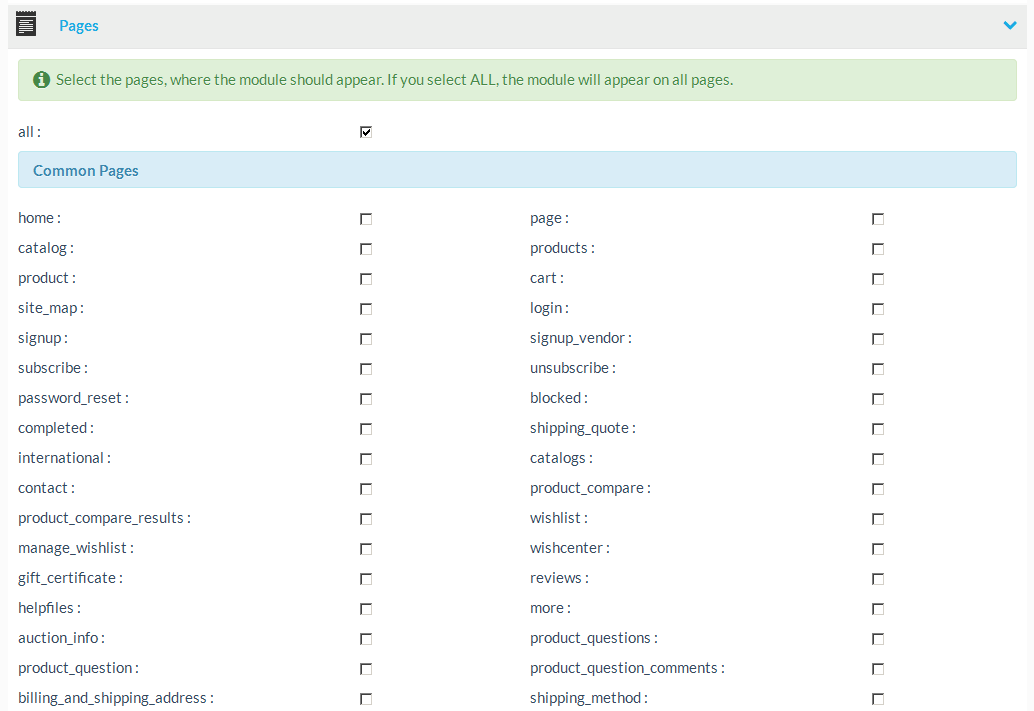 The pages section determines the pages where the module appears at the storefront, if it is active.