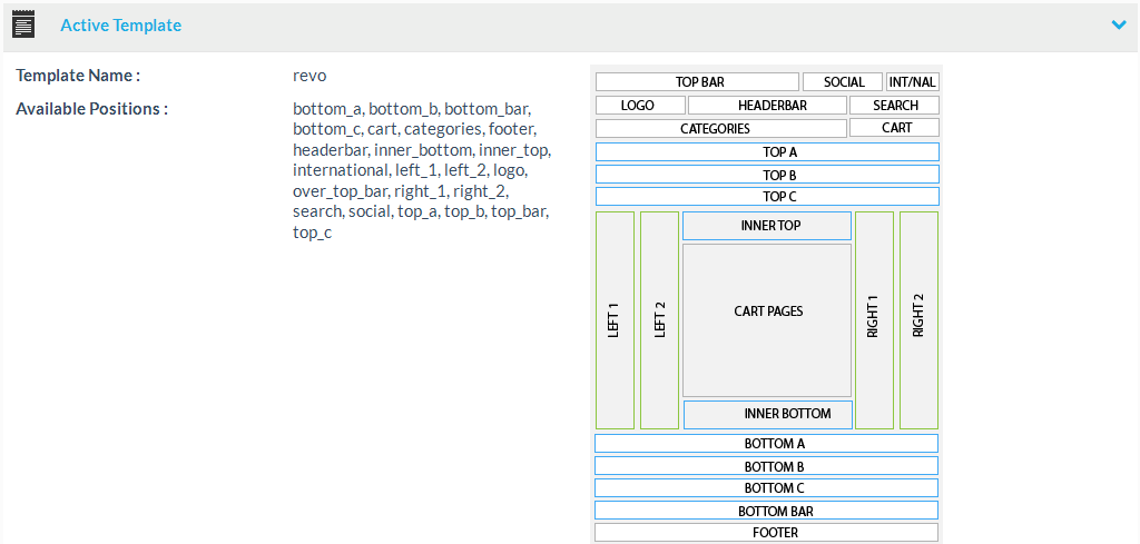The active template section gives you information about the current template and the available layout positions of the current skin template.