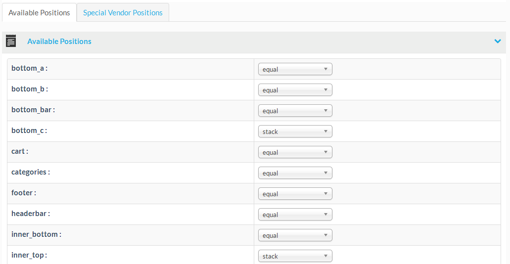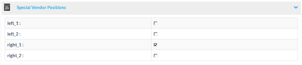 The special vendor positions section, determines, what modules are available for vendor modules. Only selected module layout positions can be selected for vendor modules.